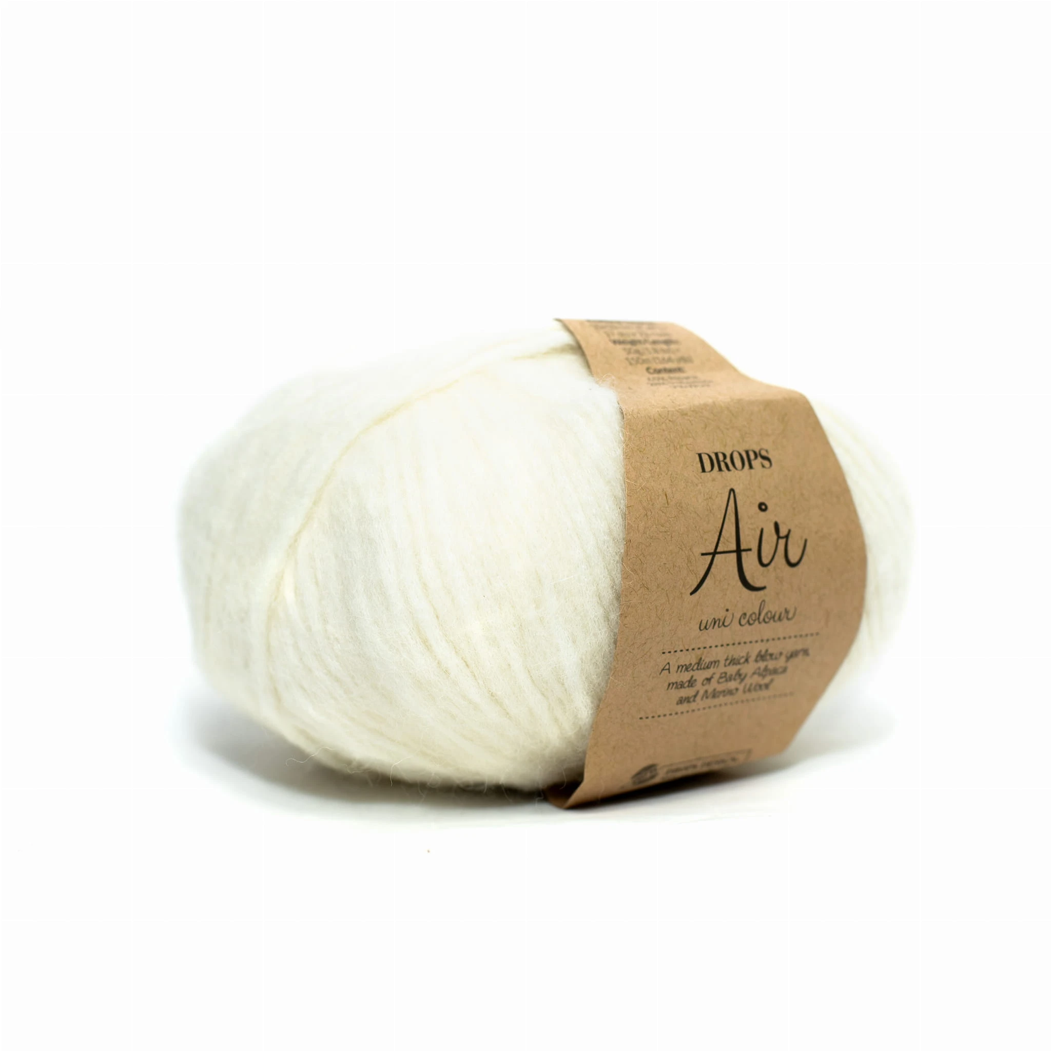 Dropa Air to włóczka „blow yarn”, mieszanka mięciutkiej baby alpaca oraz ciepłej i wygodnej wełny merino. Dzięki swojej specjalnej strukturze zapewnia lekkość dzianin. Włóczka jest doskonała na wszeliego typu szale, kominy, czapki, swetry, wspaniale eksponuje wzory strukturalne i warkocze.