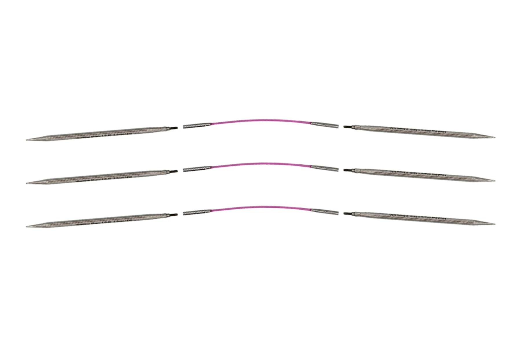 Innowacyjne wymienne druty skarpetkowe. Dzięki elastycznej żyłce, oczka leżą na dwóch drutach, trzeci służy do przerabiania. Dzięki temu przerabianie jest szybkie a robótka gładka. Druty mają rozmiar 2,50 mm.