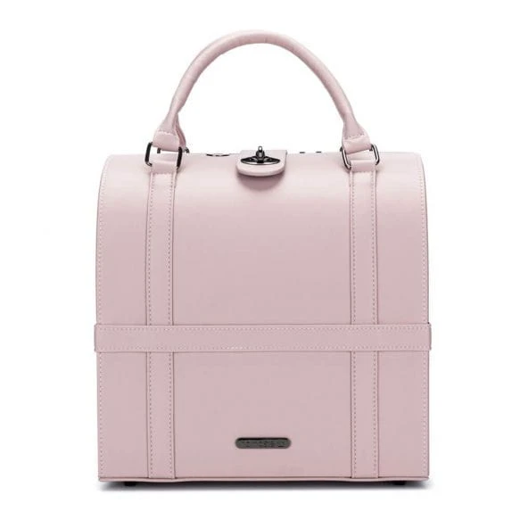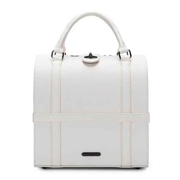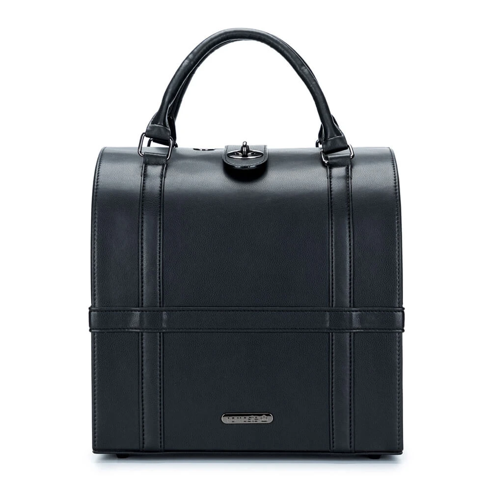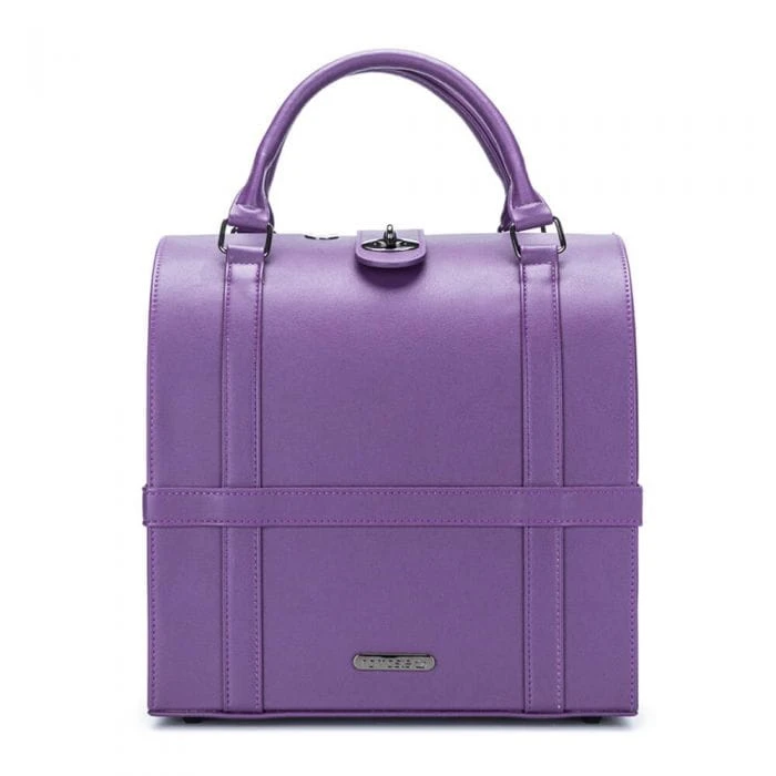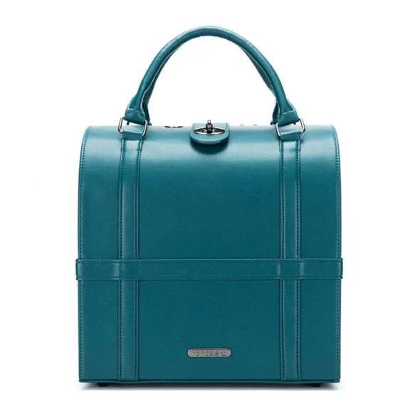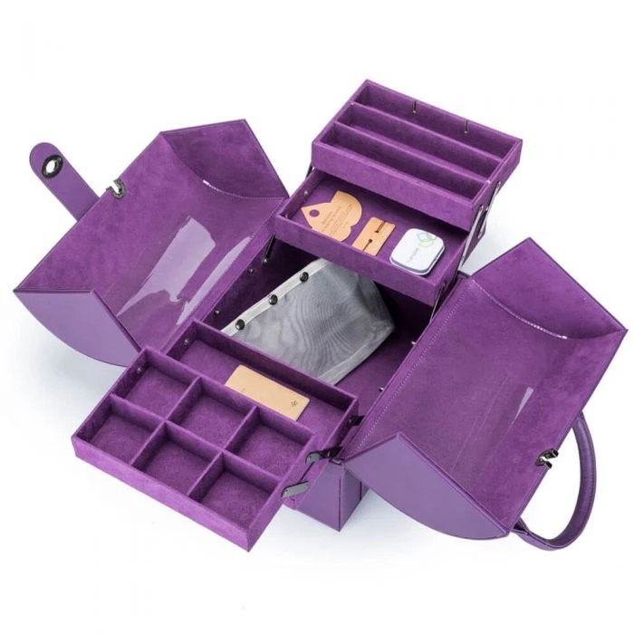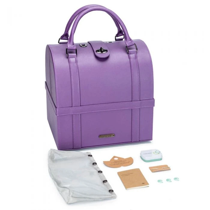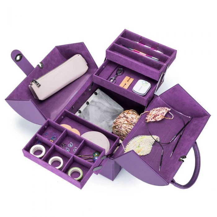 Kuferek został specjalnie zaprojektowany, pokryty wegańską skórą. Wyposażony jest w 4 x rozkładane tace, 2 x zintegrowane podajniki przędzy w kształcie litery U w górnej części, praktyczne zamknięcie na zatrzask i solidne nóżki chroniące spód. Pozwala na utrzymanie robótki wraz ze wszystkimi narzędziami i akcesoriami bezpiecznie i w uporządkowany sposób. Kufer ma wymiary 30,5 x 30,5 x 24,1 cm i zawiera następujące akcesoria: