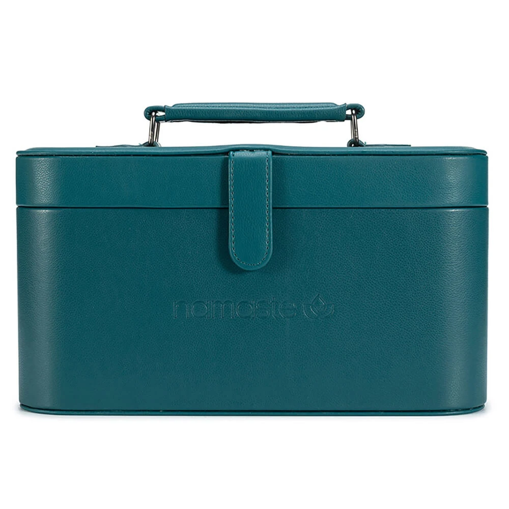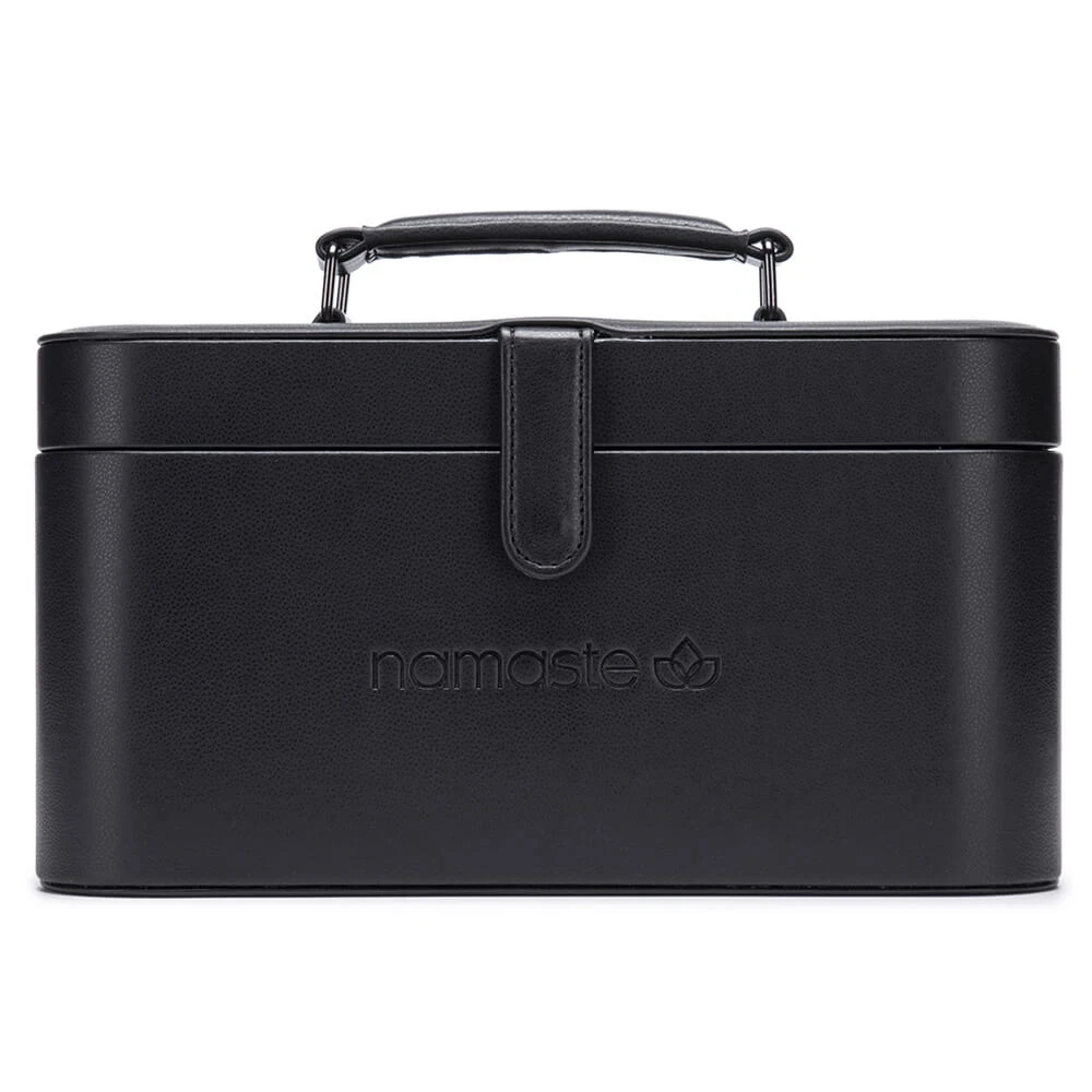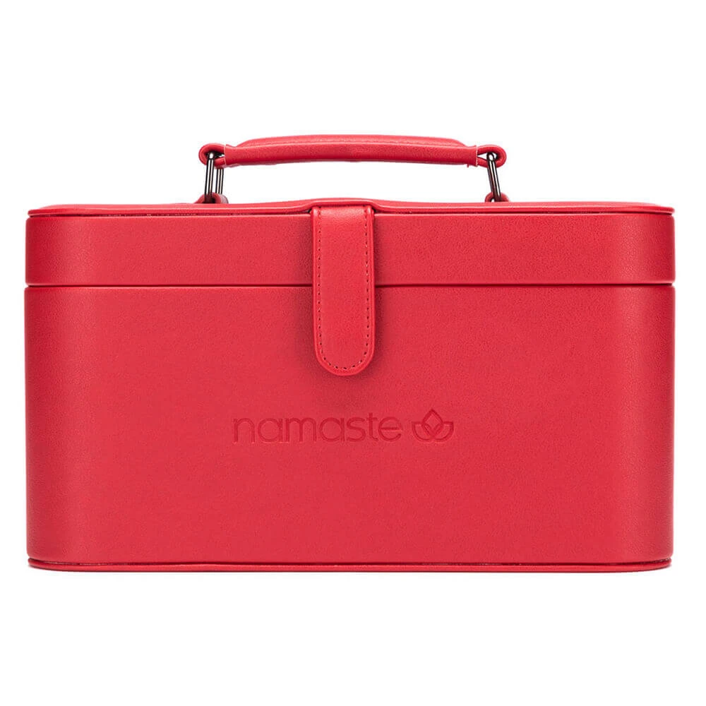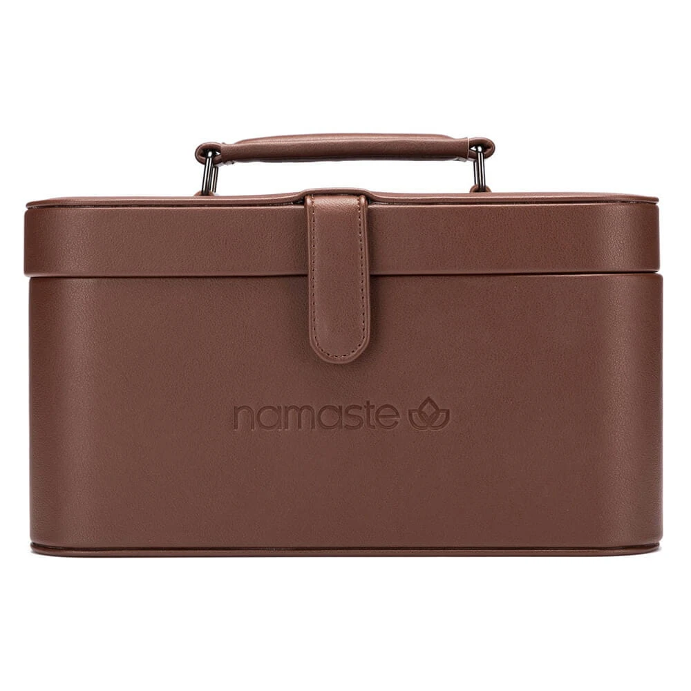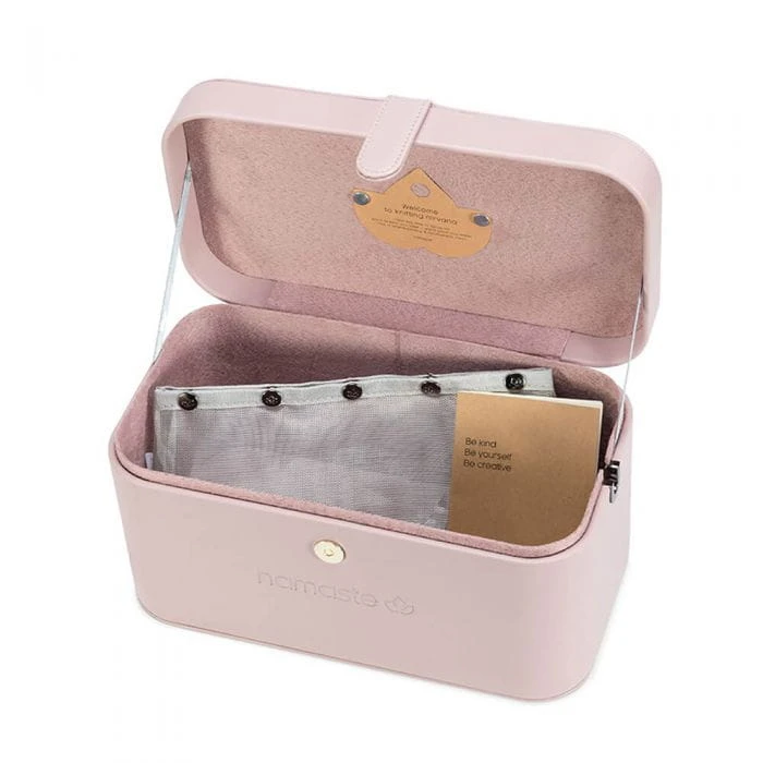 Walizeczka Namaste w stylu vintage pokryta jest wegańską skórą, wyposażona w podajnik przędzy w kształcie litery U, a także powierzchnię magnetyczną w pokrywie do wygodnego przechowywania drutów, igieł, markerów. Wymiary walizeczki: 30,5 x 16,5 x 15,2 cm. Zawiera woreczek Oh Snap do przechowywania akcesoriów.