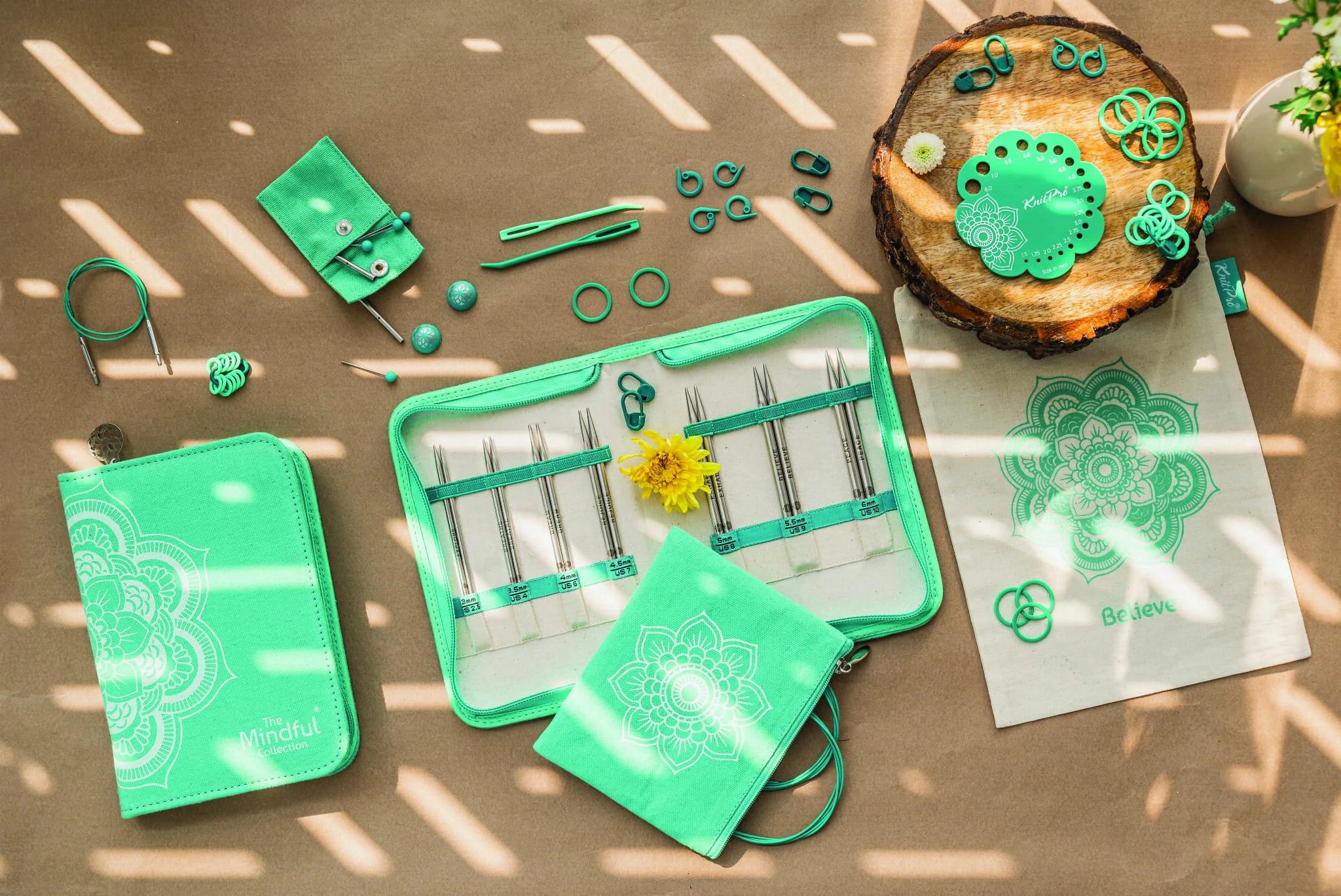 Zestaw drutów z kolekcji Mindful, w skład którego wchodzą druty długości 13 cm w rozmiarach 3,0; 3,5; 4,0; 4,5; 5,0; 5,5; 6,0; 3 żyłki z mocowaniem obrotowym o długościach 60, 80 i 100 cm; 4 zatyczki, 2 kluczyki do dokręcania, 1 para łączników do żyłek, miara grubości drutów, 2 igły dziewiarskie, 10 markerów w formie agrafki, 10 markerów pętelek, 30 markerów kółkowych. A wszystko to pięknie zapakowane w tkaninowe euti z motywem kolekcji.