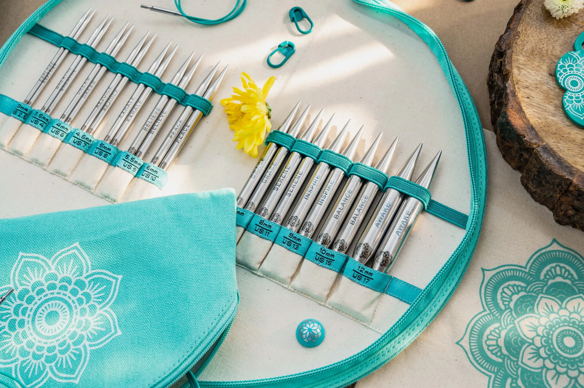 Zestaw drutów z kolekcji Mindful, w skład którego wchodzą druty długości 10 cm w rozmiarach 3,0; 3,5; 4,0; 4,5; 5,0; 5,5; 6,0; 7,0; 8,0; 9,0; 10,0; 3 żyłki z mocowaniem obrotowym o długościach 40, 50 i 60 cm; 6 zatyczek, 4 kluczyki do dokręcania, 1 para łączników do żyłek, miara grubości drutów, 2 igły dziewiarskie, 10 markerów w formie agrafki, 10 markerów pętelek, 30 markerów kółkowych. A wszystko to pięknie zapakowane w tkaninowe euti z motywem kolekcji.